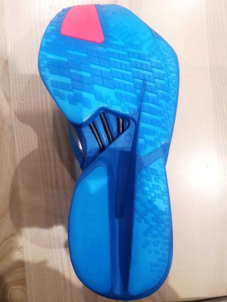 エナジーロッドの特性を最大限に活かしつつ軽量化を図るため、インサイド側の下層は大きく削減。一方、アウトサイド側はクッション性を重視し、中足部より前方では下層までを上層素材がカバーする構造になっています。