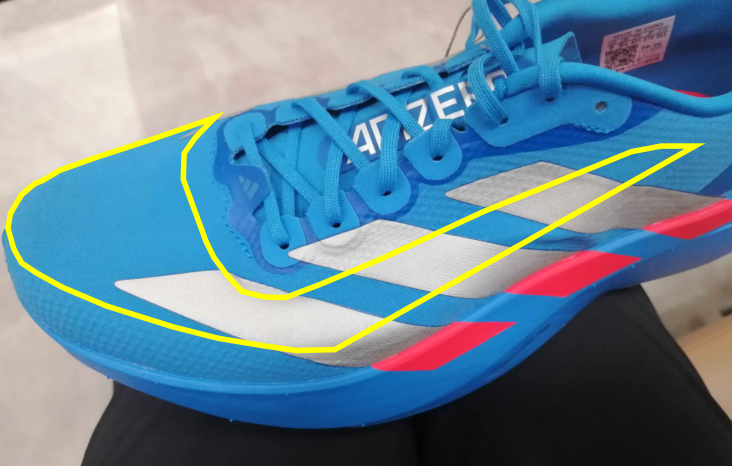 WOVENを採用したことで、張りのあるアッパー(黄色部分)は、適度な伸縮性を兼ね備えています。また、Adizeroシリーズのレーシングモデル(PRO4、SEN11)で採用されている LIGHTLOCK アッパーとは肌触りは似ていますが同じではありません。より“トレーナー寄りの快適性”を確保した素材と言えます。