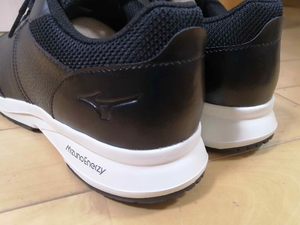 ヒール外側にはミズノの「ランバード」ロゴが型押しで入っており、遠目には控えめで上品な印象を与えます。