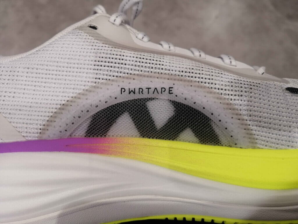 VN3では内側に補強パーツであるパワーテープが配置され、内側への倒れ込みを抑制します。アウトソールも内側がフラット構造のため、土踏まず付近のサポート力は非常に高く、安心感があります。